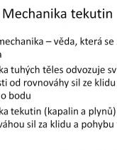 • Mechanika tekutin (kapalin a plynů) se zabývá se rovnováhou sil za klidu a pohybu tekutin.
