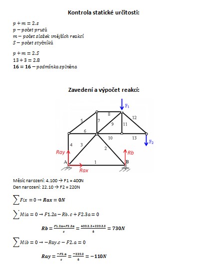 U dané prutové soustavy zvolte velikosti sil znázorněných na obrázku - velikost vnějších sil zvolte jako desetinásobek nebo stonásobek (u čísel do deseti) data vašeho narození (měsíc a den). Zkontrolujte statickou a tvarovou určitost soustavy, určete početně vazbové reakce ve vazbách (bodech A a E). Pomocí Cremonova obrazce (grafické řešení) určete síly v prutech 1 - 13 a ty pak následně zkontrolujte početní styčníkovou metodou. Pomocí průsečné metody zkontrolujte síly v prutech 8, 9 a 10 (početně). Zaznamenejte postup početního řešení s obrázky jednotlivých styčníků a rovnicemi (styčníková metoda) a u metody průsečné nakreslete se všemi působícími silami tu část soustavy, kterou budete řešit.
