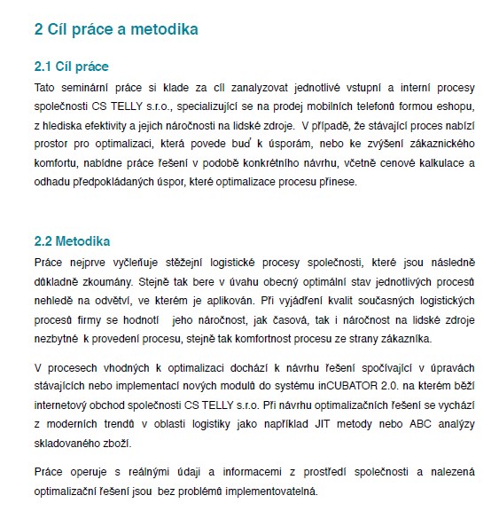 Práce nejprve detailně představuje společnost CS TELLY s.r.o. a platformou, na které běží její internetový obchod. Dále obsahuje teoretické informace a analýzy, dle kterých byly kvalifikovány jednotlivé procesy. V hlavní části práce probíhá samotné hodnocení a analýza vstupních, interních procesů (např. cenotvorba, výpočet optimálního expedice zboží pomocí JIT, řešení skladového systému) a výstupních procesů. Následně přinášíme konkrétní návrhy pro řešení optimalizace procesů. V závěru práce lze nalézt přehledně zpracované přehledy nákladů spojených s optimalizací a teoretických úspor po optimalizaci jednotlivých logistických procesů.