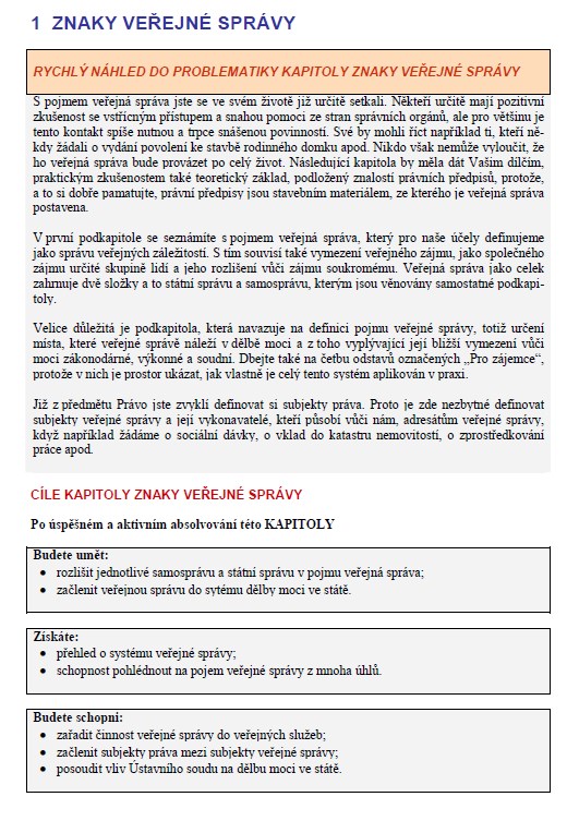 Studijní opora předmětu Základy správního práva a veřejné správy je úvodním, vstupním kurzem do širší problematiky modulu Veřejné právo, který pro studenty distanční formy studia katedra práva připravila. Veřejná správa zahrnuje poměrně širokou problematiku právních předpisů, ze kterých jsme vybrali, dle našeho názoru, ty nejdůležitější, aby si studenti dokázali udělat přehled v systému dělby moci ve státě a podílu nás, občanů na správě věcí veřejných. V mnohém zde navazujeme na předmět Právo, který již všichni studenti absolvovali v prvním ročníku studia a předpokládáme, že pokud jim nebude některý pojem zcela jasný, vrátí se ke svým studijním materiálům a předmětnou lásku si oživí.