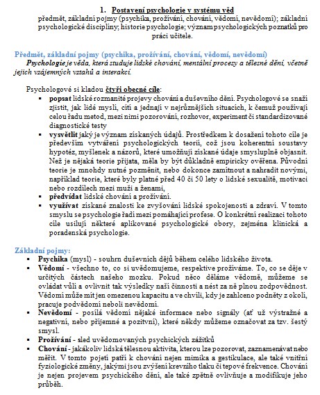 předmět, základní pojmy (psychika, prožívání, chování, vědomí, nevědomí); základní psychologické disciplíny; historie psychologie; význam psychologických poznatků pro práci učitele.