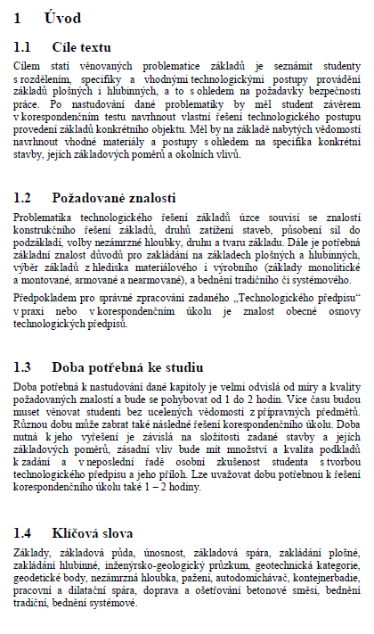 Doba potřebná k nastudování dané kapitoly je velmi odvislá od míry a kvality požadovaných znalostí a bude se pohybovat od 1 do 2 hodin. Více času budou muset věnovat studenti bez ucelených vědomostí z přípravných předmětů. Různou dobu může zabrat také následné řešení korespondenčního úkolu. Doba nutná k jeho vyřešení je závislá na složitosti zadané stavby a jejích základových poměrů, zásadní vliv bude mít množství a kvalita podkladů k zadání a v neposlední řadě osobní zkušenost studenta s tvorbou technologického předpisu a jeho příloh. Lze uvažovat dobu potřebnou k řešení korespondenčního úkolu také 1 - 2 hodiny.