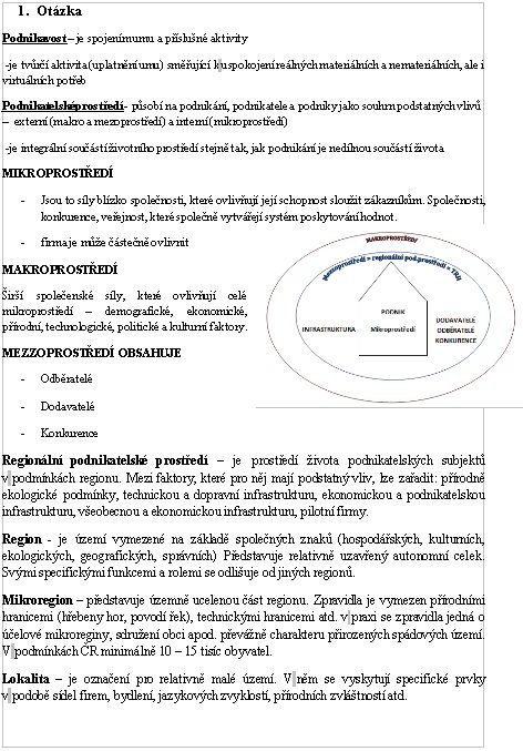 Podnikatelské prostředí - působí na podnikání, podnikatele a podniky jako souhrn podstatných vlivů - externí (makro a mezoprostředí) a interní (mikroprostředí)